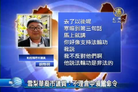 帕拉瑪塔市議員 胡煜明:「去了以後,寒暄到第三句話,馬上就講,你好像支持法輪功。我說,我不反對他們啊。他說,法輪功是非法的。我就回答他一句,我說,在我們國家是合法的。」