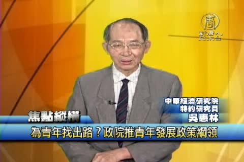 【新唐人亞太台 2015 年 03 月 26 日訊】行政院從去年推動「青年創業專案」以來,已經提供3千228家貸款或創業資金,總核貸金額超過新台幣31億元。 今天行政院會再提出青年發展政策綱領,一共提出6大面向,其中包括協助青年獲得合宜薪酬。行政院長毛治國說,政策綱領代表的是政府的宣示,也會要求各部會實際驗收成效。怎麼看目前政府所端出的青年政策?今天的焦點縱橫,為您解析。