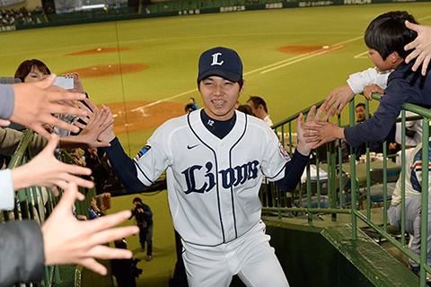 郭俊麟和球迷擊掌。(圖/西武隊官網)