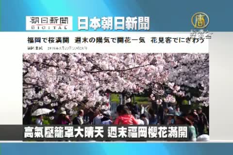 【新唐人亞太台 2015 年 03 月 30 日訊】來看到日本朝日新聞報導:高氣壓籠罩大晴天 週末福岡櫻花滿開。