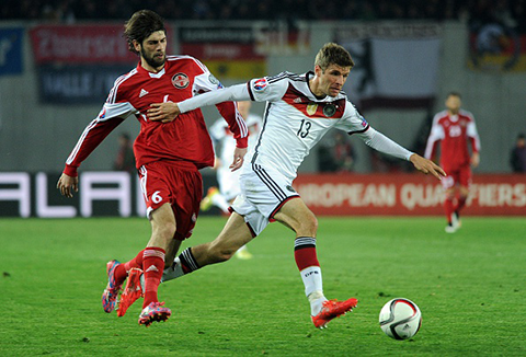 【新唐人亞太台 2015 年 03 月 30 日訊】2016歐洲國家盃D組預賽,德國在客場擺出4-2-3-1陣形對上喬治亞。這是新隊長施魏因施泰格自世界盃決賽後首次在國家隊出賽。羅伊斯為德國隊首開紀錄。上半場終了前,穆勒進球,德國2:0勝喬治亞。D組另2場比賽,波蘭和愛爾蘭1:1言和,蘇格蘭6:1大勝直布羅陀。