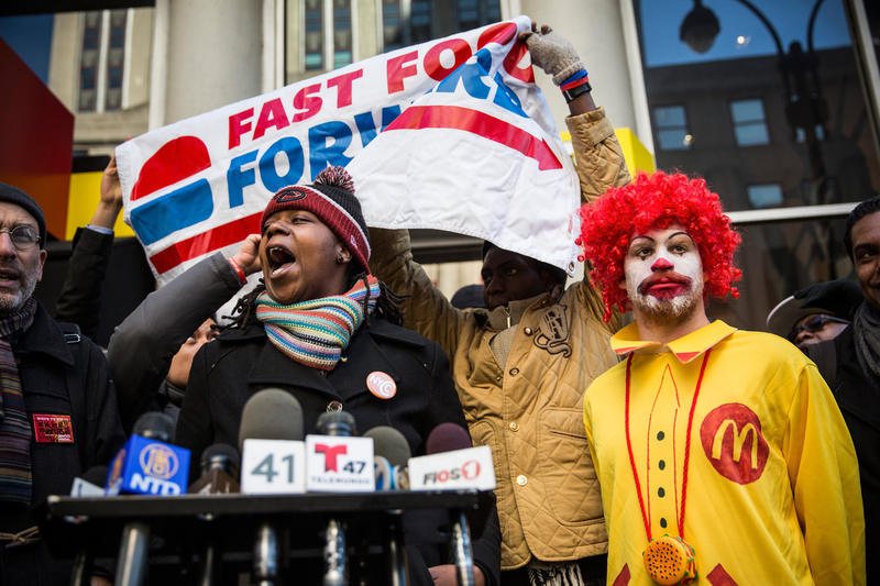 工會在麥當勞紐約店前抗議,要求公司提高最低時薪15美元。(Getty Images)