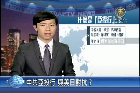 【新唐人亞太台 2015 年 04 月 01 日訊】好,我們來帶您簡單看一下,究竟亞投行,是什麼,亞投行的全名是:亞洲基礎設施投資銀行,英文是:Asian Infrastructure Investment Bank。由中國大陸、印尼、馬來西亞、新加坡、菲律賓、泰國、越南等21個國家備忘錄籌設,法定資本額為1000億美元,初始認繳資本目標為500億美元。一般認為,中共的亞投行,是為了要挑戰美國主導的世界銀行和日本主導的亞洲開發銀行。