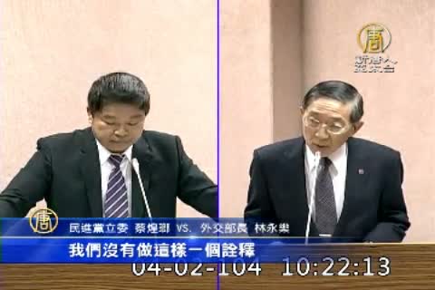 民進黨立委 蔡煌瑯 VS. 外交部長 林永樂:「告訴中國,對於M503,或者亞投行,步步逼近台灣的主權,迫降軍機,透露政治訊息說,台灣還是我們的老弟,台灣還是我美國的盟邦,這個是美國透露的訊息」「我跟委員報告,我們沒有做這樣一個詮釋」