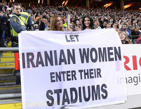球迷在伊朗與瑞典友誼賽中,呼籲讓伊朗女性進球場看球。(Photo by JONATHAN NACKSTRAND/AFP/Getty Images)
