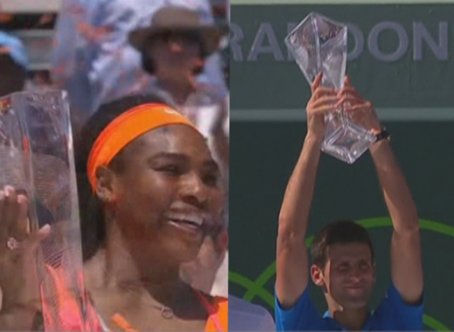 喬科維奇,以7:6、4:6、6:0打敗莫瑞,喬帥不但成功衛冕,更成為史上首位3度接連包辦印地安泉、邁阿密兩大名人賽冠軍的傳奇。而昨天(5日),美國球后小威廉絲則是用56分鐘,以6:2、6:0擊敗西班牙女將娜瓦羅,完成邁阿密網賽3連霸,她還感性地說,要把獎盃獻給臥病的父親。