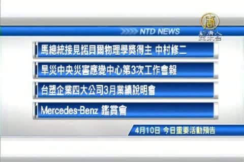 【新唐人亞太台 2015 年 04 月 10 日訊】接著看到,今天,四月10日,星期五,有哪些重要活動,總統馬英九接見2014年諾貝爾物理學獎得主中村修二。旱災中央災害應變中心,今天舉行第3次工作會報。財經消息,台塑四寶舉行三月業績說明會,另外,台灣賓士也宣布在今天將舉行智慧新車鑑賞會。