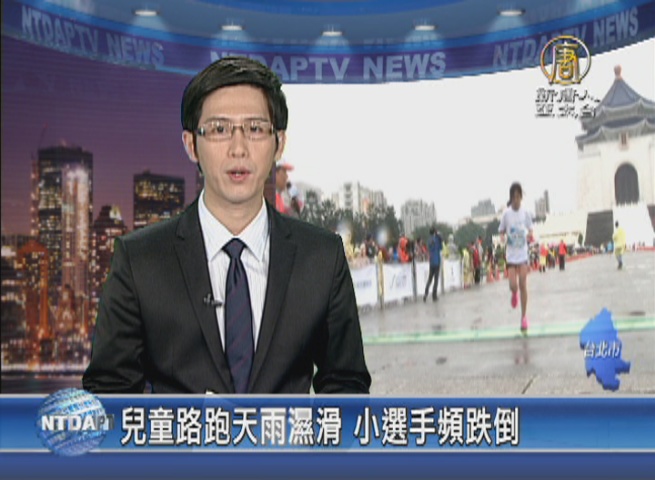 【新唐人亞太台 2015 年 04 月 11 日訊】4月11日上午在台北自由廣場有一場兒童路跑活動,雖然天公不作美,仍然吸引許多家長帶小孩參加,甚至還有來自嘉義國小也組隊北上參賽,但是終點的緩衝墊,因為下雨地墊變得很滑,不少小選手抵達終點紛紛滑倒。