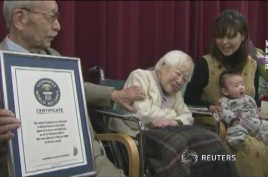 【新唐人亞太台 2015 年 04 月 12 日訊】時間巨輪不斷轉動,4月1日,全球最長壽人瑞以117歲高齡辭世,她也是日本最後一位19世紀出生的人瑞,全球最老人瑞的頭銜可望由美國人瑞接棒。她們的長壽秘訣都是:保持輕鬆,善待他人。時間像流沙一刻也不停留,最近全球最長壽的人瑞以117歲高齡辭世,她也是日本最後一位19世紀出生的人瑞,全球最老人瑞的頭銜可望由美國人瑞接棒,她們也流傳了長壽秘訣,就是保持輕鬆,善待他人。