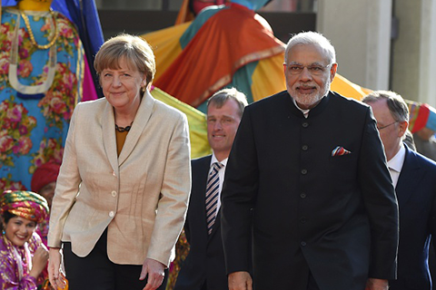 德國總理梅克爾與印度總理莫迪共同參加漢諾威工業展開幕。(Photo by TOBIAS SCHWARZ/AFP/Getty Images)