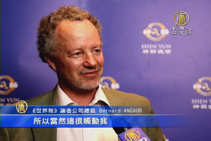 《世界報》讀者公司總裁Bernard ANGAUD:「文化和宗教信仰部分展開的很好,有一種普世的善良貫穿在整場演出中,她表達了善良、寬容,中華民族的開?,演出很好的展現了這些。這些價值觀是在西方被普遍認同的,也是我個人作為世界報讀者公司總裁所試圖弘揚的,所以當然這很觸動我。」