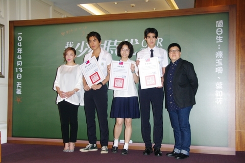 【新唐人亞太台 2015 年 04 月 14 日訊】「夏于喬二世」宋芸樺昨(13)日出席電影《我的少女時代》殺青記者會,花3小時化妝,戴著俗氣的金框眼鏡,滿臉雀斑以及起床不整理的髮型,表現傻氣與不修邊幅,導演陳玉珊還頒給她「最佳笑花獎」相當逗趣,她自嘲:「醜到連爸媽都認不出來。」王大陸則拿到「留校查看」,他飾演校園小霸王,頂著痞學生油頭、「蟑螂鬚」瀏海搞笑現身。