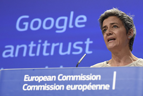 歐盟反壟斷負責人維斯塔格正式向Google提告。(Photo by JOHN THYS/AFP/Getty Images)