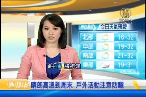 【新唐人亞太台 2015 年 04 月 17 日訊】歡迎您收看4月17日的早安新唐人,我是張祺翎。先來帶您關心今天的天氣情況。今天白天受到偏東風影響,台灣各地除了東半部地區雲量較多之外,其他地區為晴時多雲的天氣,中南部局部山區午後有機會出現短暫陣雨。溫度部分,白天高溫約29到31℃,中午時間紫外線比較強烈,須留意防曬。但早晚氣溫仍然偏涼,約在18到21℃,早出晚歸請留意添加衣物。帶您一起來看到國際媒體重要訊息。