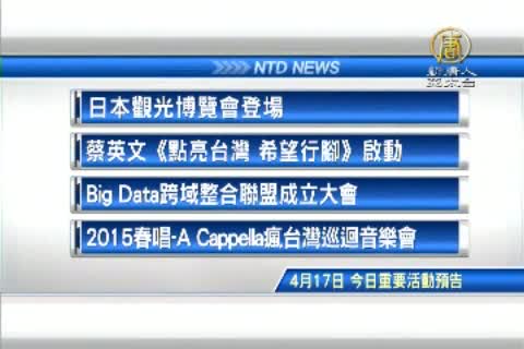 【新唐人亞太台 2015 年 04 月 17 日訊】接著看到,今天,四月17日,星期五,有哪些重要活動,史上規模最大日本觀光博覽會在台北花博公園登場。蔡英文《點亮台灣 希望行腳》啟動。Big Data跨域整合聯盟成立大會。以及,2015春唱-A Cappella瘋台灣巡迴音樂會。
