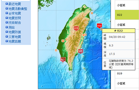 【新唐人亞太台 2015 年 04 月 20 日訊】今天上午九點42分左右,台灣東部海域附近發生規模6.3有感地震,震源深度17.5公里。
