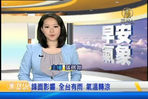 【新唐人亞太台 2015 年 04 月 21 日訊】歡迎您收看4月21日的早安新唐人,我是張祺翎。先來帶您關心今天的天氣情況。受到鋒面影響,今天全台各地都會出現陣雨,其中又以中部以北雨勢較大,提醒您出門記得帶傘,上班上課天雨路滑,務必多加注意路況。氣溫方面,由於下雨,氣溫也比前幾天涼爽許多,北部地區約17到21℃,民眾出門時記得加件外套,而中、南部地區則約20到27℃。帶您一起來看到國際媒體重要訊息。