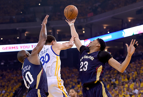 鵜鶘大前鋒戴維斯(23)阻斷勇士隊柯瑞(30)的傳球。(Photo by Thearon W. Henderson/Getty Images)