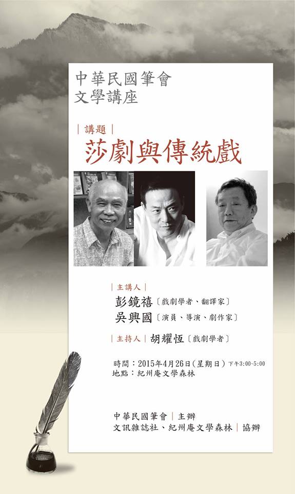 此次由中華民國筆會主辦的「莎劇與傳統戲」講座,邀請台灣大學莎士比亞學會戲劇學者暨知名翻譯彭鏡禧教授,與臺灣藝術大學表演所教授暨當代傳奇劇場藝術總監吳興國對談,主持人為戲劇學者胡耀恆,時間為4月26日下午3時,地點在紀州庵文學森林(台北市中正區同安街一○七號)。