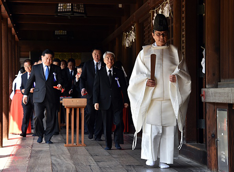 一百多位日本國會議員在22號參加靖國神社春祭。(Photo by YOSHIKAZU TSUNO/AFP/Getty Images)
