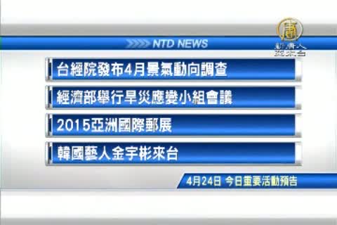 【新唐人亞太台 2015 年 04 月 24 日訊】接著看到,今天,四月24日,星期五,有哪些重要活動,台經院發布4月景氣動向調查,人力銀行要公布「職場爆肝與壓力指數調查」。另外,今天有一場,2015亞洲國際郵展。娛樂消息,韓國藝人金宇彬今天來台。