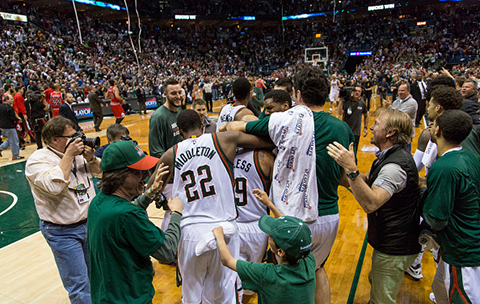 【新唐人亞太台 2015 年 04 月 26 日訊】面臨淘汰邊緣的公鹿隊,在第四戰比分始終緊咬公牛。第四節還曾領先公牛隊8分,但公牛在最後38.4秒將比分追平。比賽剩下1.3秒,兩隊90比90平手。公鹿隊貝勒斯在籃下接獲傳球,並且在羅斯的看管下投進絕殺球,公鹿92:90獲勝,避免被橫掃出局。