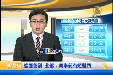 【新唐人亞太台 2015 年 04 月 28 日訊】歡迎您收看4月28日的早安新唐人,我是沈唯同。先來帶您關心今天的天氣情況。昨天還是陽光普照的穩定天氣,今天開始有了變化,新的一波鋒面報到,北部、東半部會轉為有短暫雨的天氣,高溫比昨天略降約2到3℃,感覺會比較沒那麼熱;中南部受鋒面影響較小,上午天氣穩定悶熱,高溫有30到32℃,而接近山區一帶則有短暫陣雨,民眾戶外活動記得多補充水分並留意防曬。這波鋒面預計影響2天,周四開始水氣減少,西半部又會恢復晴到多雲的穩定天氣型態。帶您一起來看到國際媒體重要訊息。