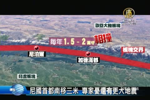 【新唐人亞太台 2015 年 04 月 28 日訊】尼泊爾規模7.8的極淺層地震,因為不耐震的土磚房加上山崩,死傷嚴重,其實,尼泊爾所在的喜馬拉雅山區板塊,運動頻繁,一週前,全球專家早就開會示警,但還是難以挽回悲劇。從圖上來看,尼泊爾位在一直互相撞擊的印度板塊和歐亞大陸板塊的交界處,每年以一點五到兩英寸的速度相撞,有印度學者在兩個月前預警,喜馬拉雅山脈中部已經有七百年不曾劇烈變動,強震是早晚的問題,而專家發現,加德滿都下方的斷層甚至滑動三公尺,也可以說「地震把加德滿都往南移三公尺」,另外,專家呼籲,這次地震可能不是最大的,要防範更強烈地震襲擊。