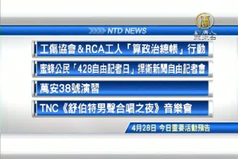 【新唐人亞太台 2015 年 04 月 28 日訊】接著看到,今天,四月28日,星期二,有哪些重要活動,工傷協會&RCA工人「算政治總帳」行動。蜜蜂公民「428自由記者日,捍衛新聞自由」記者會。下午1點,有萬安演習,以及,TNC《舒伯特男聲合唱之夜》音樂會。