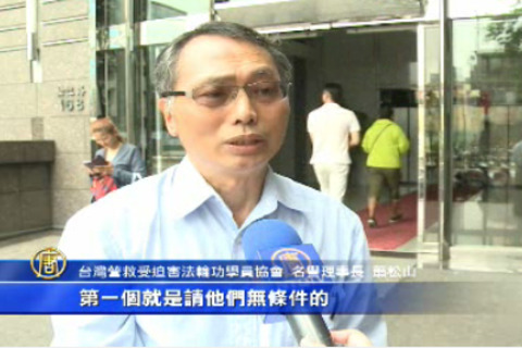 台灣營救受迫害法輪功學員協會 名譽理事長 蕭松山:「請他們的代表,幫我們轉達這兩個訴求,第一個就是請他們無條件的,盡快的釋放這些,持有聯合國保護信的法輪功學員,趕快把他們釋放出來。」