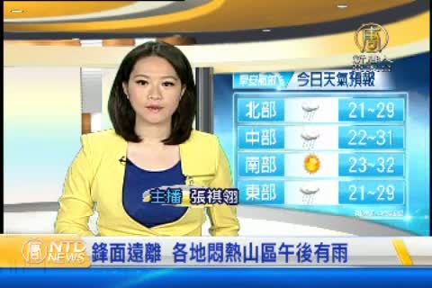【新唐人亞太台 2015 年 04 月 29 日訊】歡迎您收看4月29日的早安新唐人,我是張祺翎。先來帶您關心今天的天氣情況。今天,鋒面逐漸遠離,北部山區及東半部有短暫陣雨,中南部山區下午可能會有局部雷陣雨,其他地區則為多雲的天氣。氣溫方面,白天各地仍然比較悶熱,北部氣溫約21到28℃,中南部約22到30℃。另外,提醒大家目前旱象還是很嚴峻,短期內並沒有明顯的降雨跡象,一定要節約用水!帶您一起來看到國際媒體重要訊息。