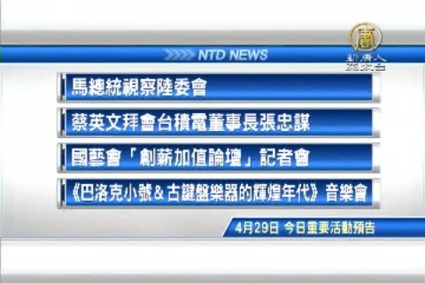 【新唐人亞太台 2015 年 04 月 29 日訊】接著看到,今天,四月29日,星期三,有哪些重要活動,馬總統到陸委會視導並發表談話。民進黨主席蔡英文拜會台積電董事長張忠謀。國藝會「創薪加值論壇」記者會,以及,歐洲宮廷音樂會《巴洛克小號&古鍵盤樂器的輝煌年代》。