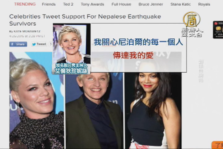 尼泊爾遭受規模7.8強震,首都加德滿都滿目瘡痍,文化古蹟幾乎全毀,死亡人數不斷攀升。不少好萊塢明星在自己的推特或臉書上,表達對尼泊爾的關心。