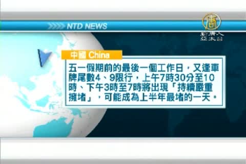 五一假期前的最後一個工作日,又逢車牌尾數4、9限行,上午7時30分至10時、下午3時至7時將出現「持續嚴重擁堵」,可能成為上半年最堵的一天。