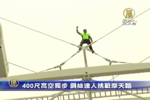 【新唐人亞太台 2015 年 04 月 30 日訊】曾在尼加拉瓜大瀑布、科羅拉多大峽谷、以及芝加哥的摩天大樓之間,進行「高空鋼絲行走」的鋼絲達人尼克‧瓦倫達,周三再創紀錄,又成功完成了在400英尺高的摩天輪上的獨步行走。