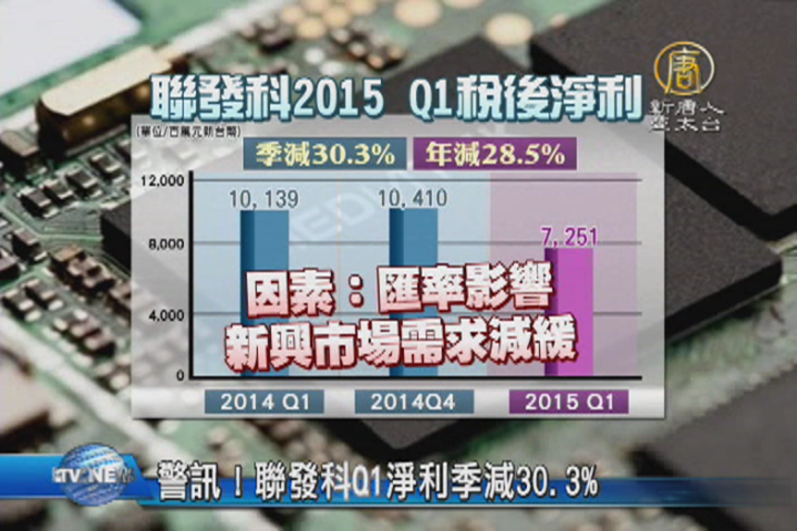 【新唐人亞太台 2015 年 04 月 30 日訊】國內IC設計大廠,聯發科今日召開法說會,第一季每股盈餘4.62元,季減30.5%,年減32.2%,聯發科表示,表示受到新興市場匯率因素影響,短期需求疲弱,影響手機市場,加上新興市場3G、4G競爭加劇,預估第二季營收恐怕將季減5%,不過對於全年預估出貨目標,聯發科則仍維持不變。