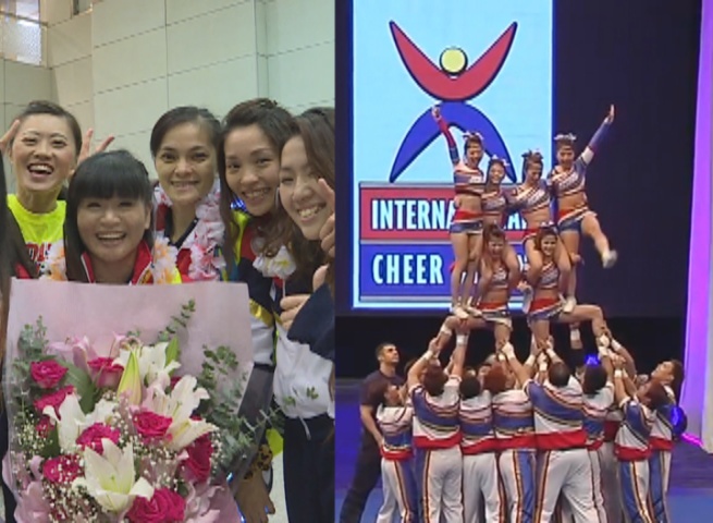 【新唐人亞太台 2015 年 04 月 30 日訊】在2015年世界啦啦隊錦標賽中,壓倒地主美國隊,首度奪下競技啦啦隊混合團體組冠軍的中華台北隊。29日深夜凱旋歸國,受到隊友、家屬們的熱烈歡迎,並與大家分享這次獲得世界冠軍的喜悅。