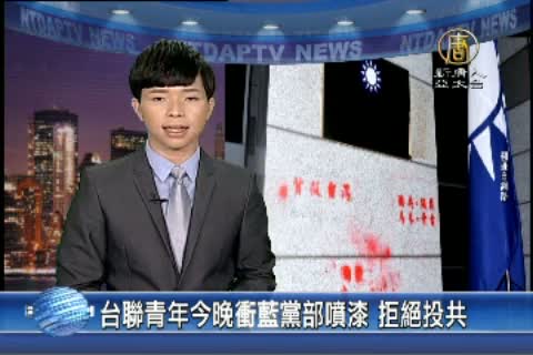 【新唐人亞太台 2015 年 05 月 01 日訊】好,就在朱立倫開完記者會後,台聯青年軍今天晚上前往國民黨中央黨部噴漆抗議,呼籲拒絕投共,明天朱立倫搭機赴中國,台聯將會再發起相關抗議活動。