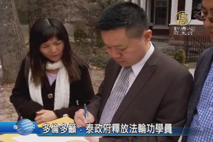 【新唐人亞太台 2015 年 05 月 01 日訊】被懷疑迫於中共壓力,泰國陸續拘捕獲得聯合國避難署保護的法輪功學員,目前還有19位被非法關押在泰國移民局拘留中心,今天,三位曾逃難泰國並輾轉來到加拿大的法輪功學員向泰國駐多倫多領事館提交請願信,希望泰國政府無條件釋放受保護的法輪功學員。