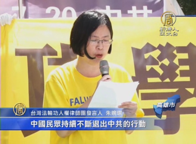 【新唐人亞太台 2015 年 05 月 02 日訊】今天(2日)下午,在高雄市的三多商圈,有超過1500名法輪功修煉者齊聚遊行,聲援二億中國人退出中共黨、團、隊組織;台灣法輪功人權律師團發言人朱婉琪律師說,中國民眾不斷退出中共的行動,已經粉碎了台灣和香港對中共不切實際的幻想。