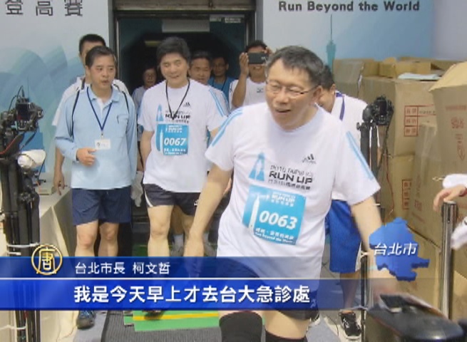 【新唐人亞太台 2015 年 05 月 03 日訊】台北市長柯文哲今天上午到101挑戰登高賽,先前柯文哲曾經說,相信自己40分鐘內就能爬完91樓。不過今天柯文哲是用了45分鐘才到達終點,賽後他受訪時說,今天身體狀況不好,早上還先去台大醫院掛急診。