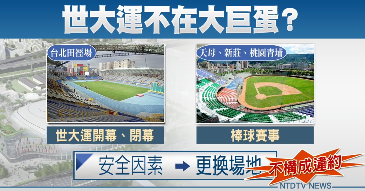 更改地點後,世大運開幕、閉幕,將改在台北田徑場辦理。而原本要在大巨蛋進行的棒球賽事,也將移到天母棒球場、新莊棒球場、桃園青埔棒球場舉辦。體育局說,如果因為安全因素必須更換場地,不構成違約。