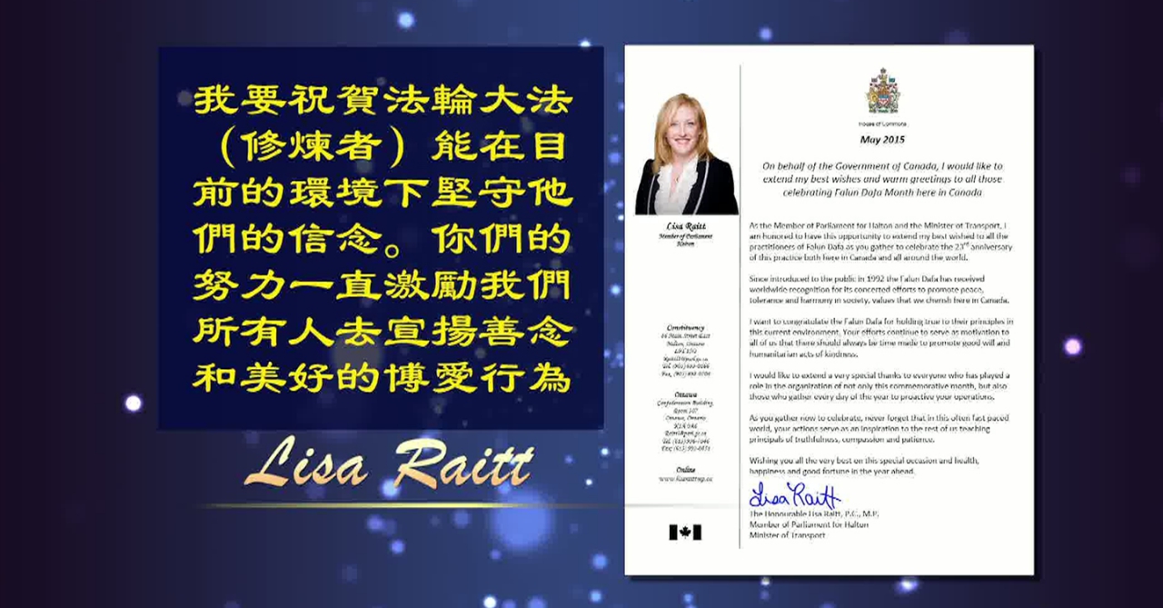 加拿大聯邦交通部長麗莎‧雷蒂(Lisa Raitt)已連續多年發出賀信。在今年的賀信中,雷蒂對「所有參與加拿大『法輪大法月』慶祝活動的人們表示最衷心和熱烈的祝賀」。