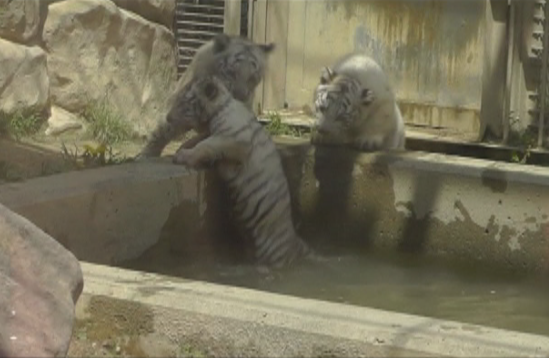 在東京郊區埼玉縣(Saitama)的東武動物公園(Tobu Zoo),一月25日誕生了四胞胎白老虎兄弟,如今已經將近三個月大了,牠們首次被放出來進入牠們的玻璃籠裡。