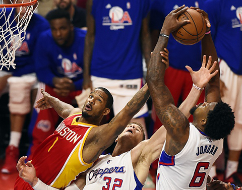 快艇隊喬丹(圖右)共下全場最高26分、17籃板。34次站上罰球線,罰進14分。(Photo by ROBYN BECK/AFP/Getty Images)