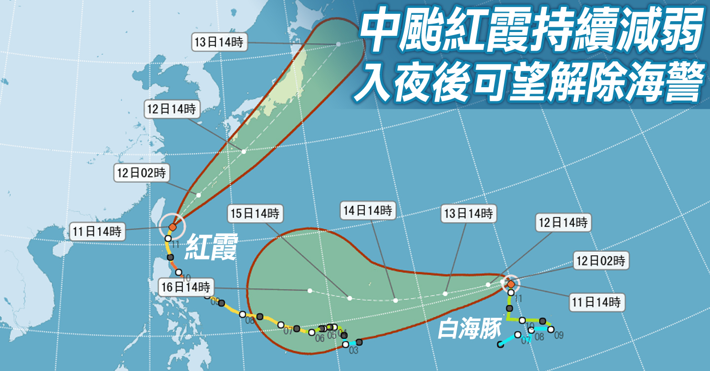 【新唐人亞太台 2015 年 05 月 11 日訊】再來關注,中颱「紅霞」持續減弱並加速向東北移動,氣象局預計(11日)入夜後可望解除海上颱風警報,但昨天紅霞登陸菲律賓呂宋島造成2人死亡,共有1萬1千人被疏散。