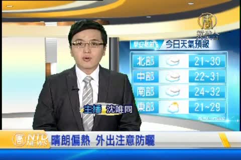 【新唐人亞太台 2015 年 05 月 13 日訊】歡迎您收看5月13日的早安新唐人,我是沈唯同。先來帶您關心今天的天氣情況。昨天一場大雨,為台灣西部帶來滋潤,稍解嚴峻的水旱,不過今天起,太平洋高壓增強,天氣轉為晴朗炎熱,全台恢復為多雲到晴的穩定天氣,山區午後有短暫雷陣雨,並有較大雨勢發生機會。各地白天炎熱,西半部高溫可達32到34℃,東半部約30到32℃,紫外線也會越來越強,戶外活動記得做好防曬工作並多補充水分。帶您一起來看到國際媒體重要訊息。