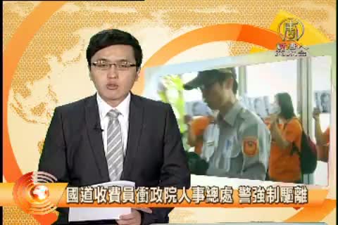 【新唐人亞太台 2015 年 05 月 13 日訊】國道收費員自救會上午突襲行政院人事行政總處,要求行政院長毛治國出來面對後續安置問題,稍早有30位抗議民眾衝進人事長室,與警方對峙。畫面中可以看到自救會成員高喊口號,有部分聲援的團體在一樓靜坐。被警方強制抬離。他們高喊「廢除約聘僱,面對收費員」,要求行政部門,給他們一個交代。