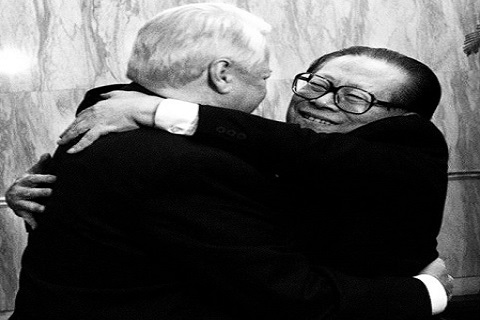 大陸媒體近日刊文提到「揭秘江澤民在俄閱兵式後的講話」,稱在二十年前,同樣的活動、同樣的地點,中共的領導人卻被冷落。江澤民曾在1999年12月9日在釣魚台國賓館會見葉利欽,向世人展示了他特有的「江氏擁抱」。(網絡圖片)