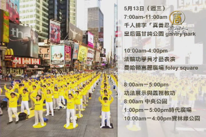 5月13日法輪大法日當天,法輪功學員將在紐約市中心地帶,排出巨幅「真善忍」字型、展示才藝、進行功法演示和義務教功等。14號,約八千名法輪功學員將雲集紐約,舉行年度修煉心得交流會。15號,法輪功學員將遊行穿越曼哈頓的中心地帶。